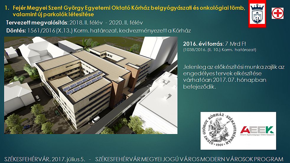 A Fejér Megyei Szent György Egyetemi Oktató Kórház belgyógyászati és onkológiai tömbjének, valamint új parkolók építésének a megvalósítása, melyre a 2016. évi forrás 7 milliárd forint, és jelenleg az előkészítési munka zajlik. Az engedélyezési tervek nyáron készen lesznek.