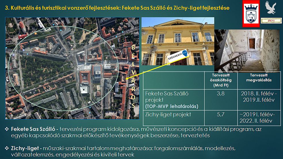 A Fekete Sas Szálló rekonstrukciójának és fejlesztésének a tervezett összköltsége 3,8 milliárd forint, mely művészeti koncepció kidolgozását és kiállítási program megtervezését foglalja magában, aminek a megvalósítása várhatóan 2018. II. félév - 2019. II. félév. A Zichy liget rendezésével kapcsolatos fejlesztésekre 5,7 milliárd forint áll rendelkezésre, aminek várható megvalósulása 2019. I. félév - 2022. II. félév.