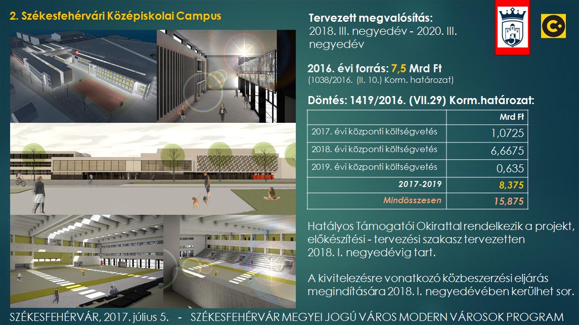 A Középiskolai Campus megvalósítására a 2016. évi forrás 7,5 milliárd forint. Míg a 2017-2019 évek központi költségvetési keretösszege 8,375 milliárd forint. A projekt előkészítési-tervezési szakasza várhatóan 2018. első negyedévéig tart, amikor a kivitelezésre vonatkozó közbeszerzési eljárás indul.