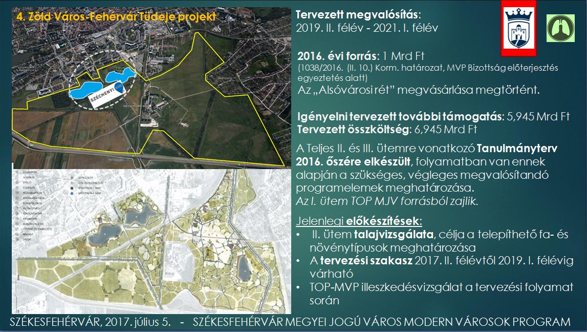 A Zöld Város - Fehérvár Tüdeje projekt tervezett megvalósítása 2019. II. félév – 2021. I. félév. Erre a 2016. évi forrás egymilliárd forint, míg az igényelni tervezett további támogatás 5,945 milliárd forint. Az „Alsóvárosi rét” megvásárlása megtörtént, a II. és III. ütemre vonatkozó Tanulmányterv 2016 őszére elkészült. Jelenleg folyamatban van a II. ütem talajvizsgálatának az előkészítése, valamint a tervezési szakasz, mely 2017. II. félévtől 2019. I. félévig várható.