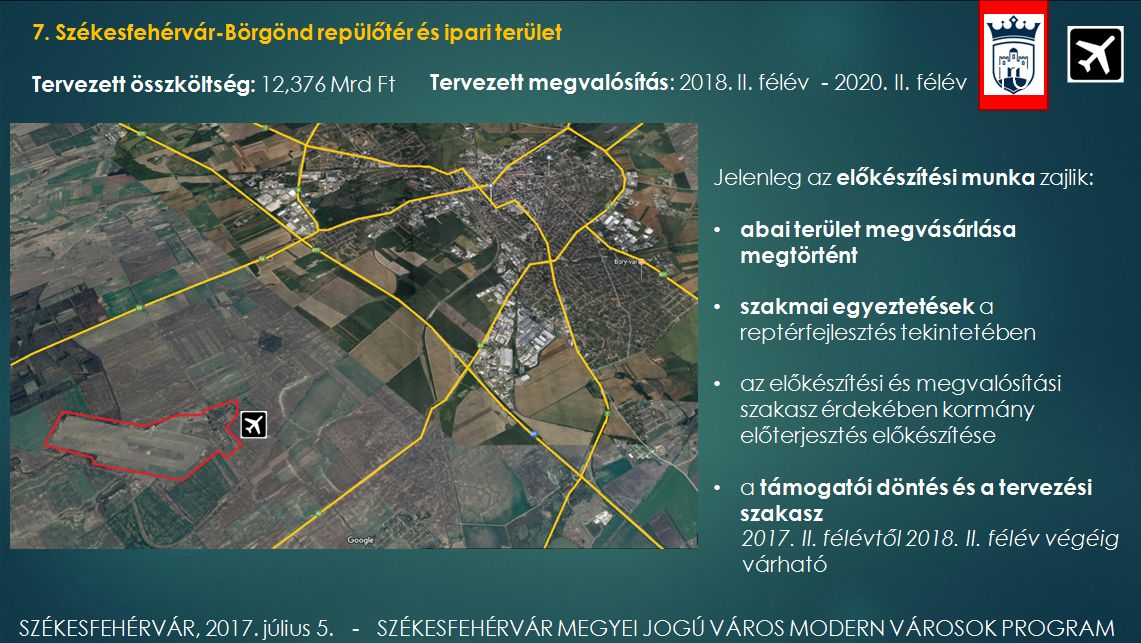 Székesfehérvár - Börgönd repülőtér és ipari terület fejlesztésére a tervezett összköltség 12,376 milliárd forint. A tervezett megvalósítás 2018. II. félév – 2020. II. félév. Jelenleg az előkészítési munka zajlik: a szakmai egyeztetések, a kormány előterjesztés előkészítése, valamint a támogatói döntés és a tervezési szakasz folyamata, mely 2017. II. félévtől 2018. II. félév végéig várható.